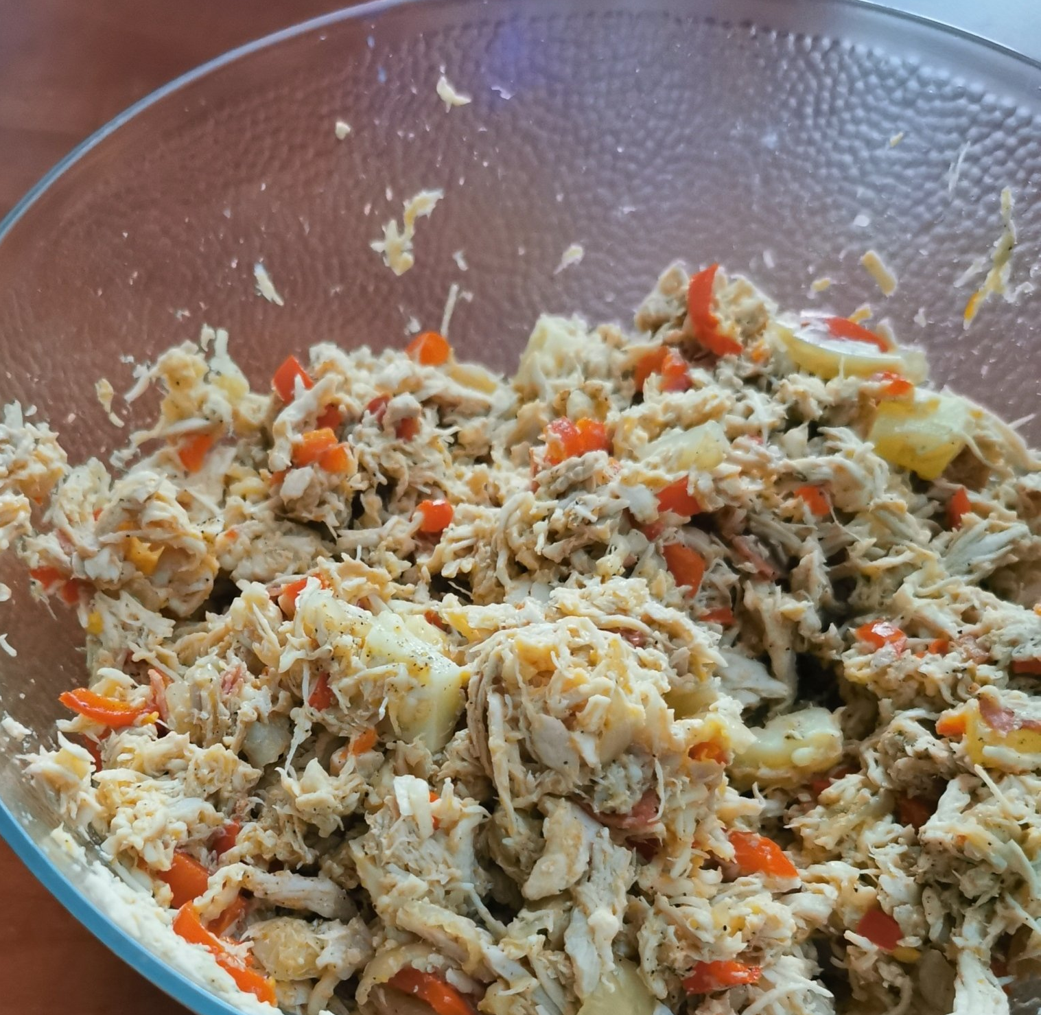 - Σε ένα μεγάλο μπολ αναμειγνύουμε το κοτόπουλο, τις πιπεριές και λιώνουμε με ένα πιρούνι το κρεμμύδι που είχαμε βράσει