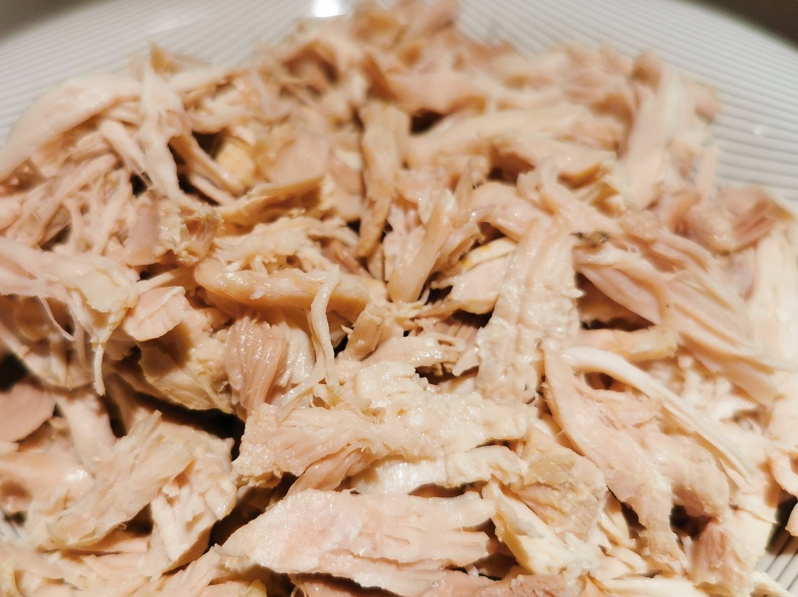 - Βράζουμε σε μια κατσαρόλα τα στήθη και το κρεμμύδι μέχρι να μαλακώσουν. Τα αφήνουμε λίγο να κρυώσουν και ξεκινάμε να μαδάμε το κοτόπουλο σε ίνες. Δεν πετάμε το ζωμό, θα μας χρειαστεί στην συνέχεια